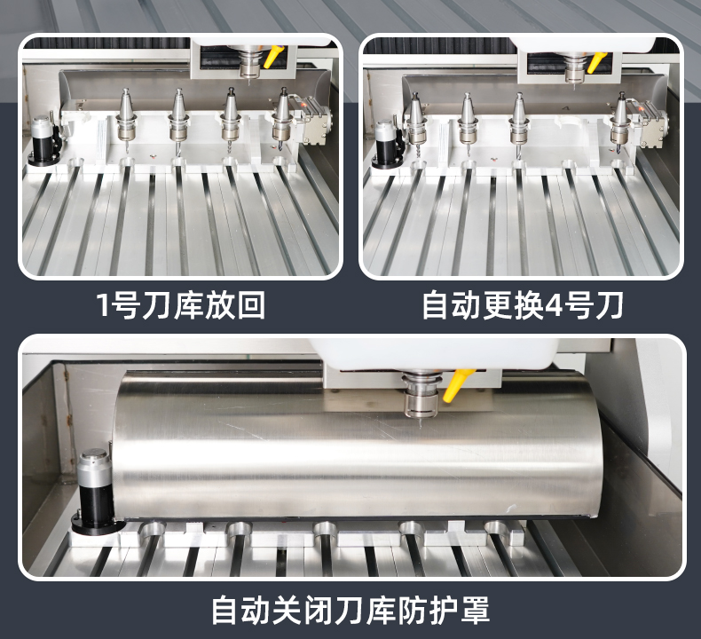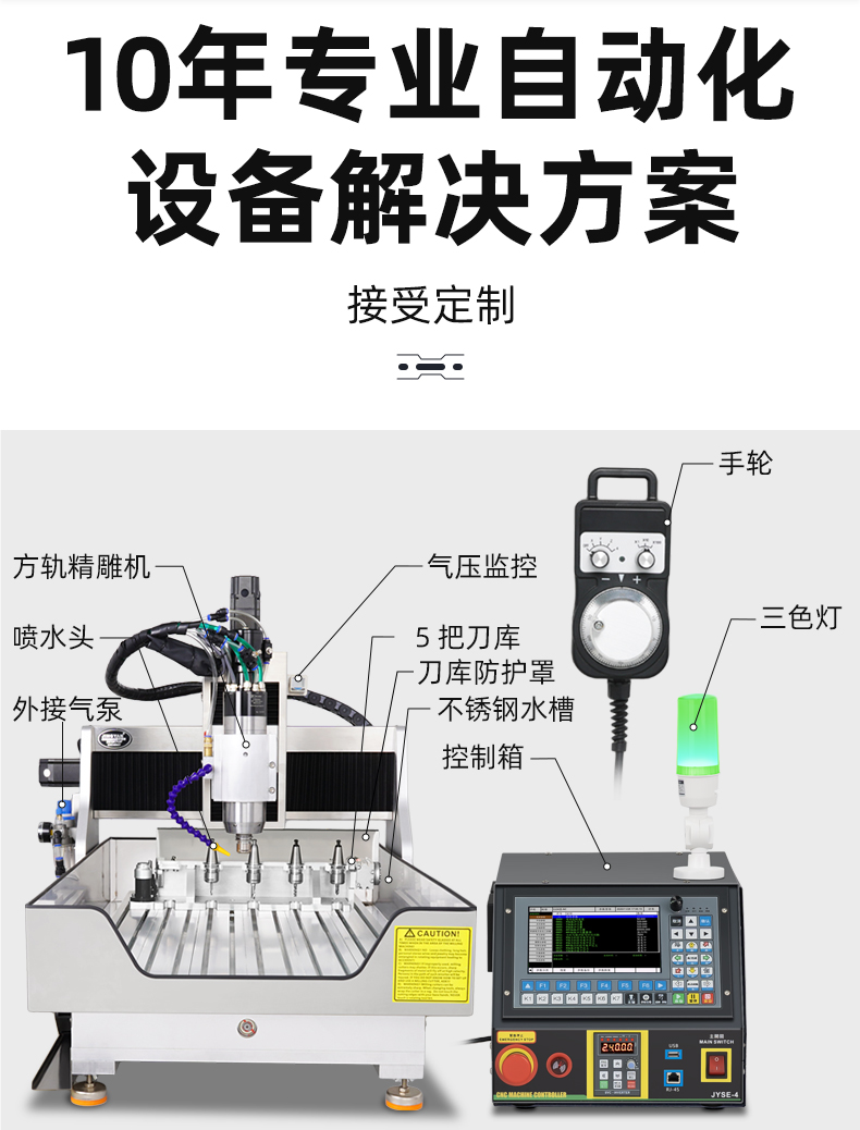 晶研F系列自動(dòng)換刀方軌精雕機(jī),專為高效多工序加工設(shè)計(jì),設(shè)備具備自動(dòng)換刀功能,提高加工效率,操作面板位于左側(cè),配有顯示屏和控制按鈕,機(jī)床頂部裝有主軸和刀具,用于執(zhí)行加工任務(wù),冷卻系統(tǒng)確保加工過(guò)程中溫度控制,黃色安全警示標(biāo)簽提醒操作安全,整體設(shè)計(jì)旨在提升生產(chǎn)效率和加工精度,適合精密制造領(lǐng)域使用。
