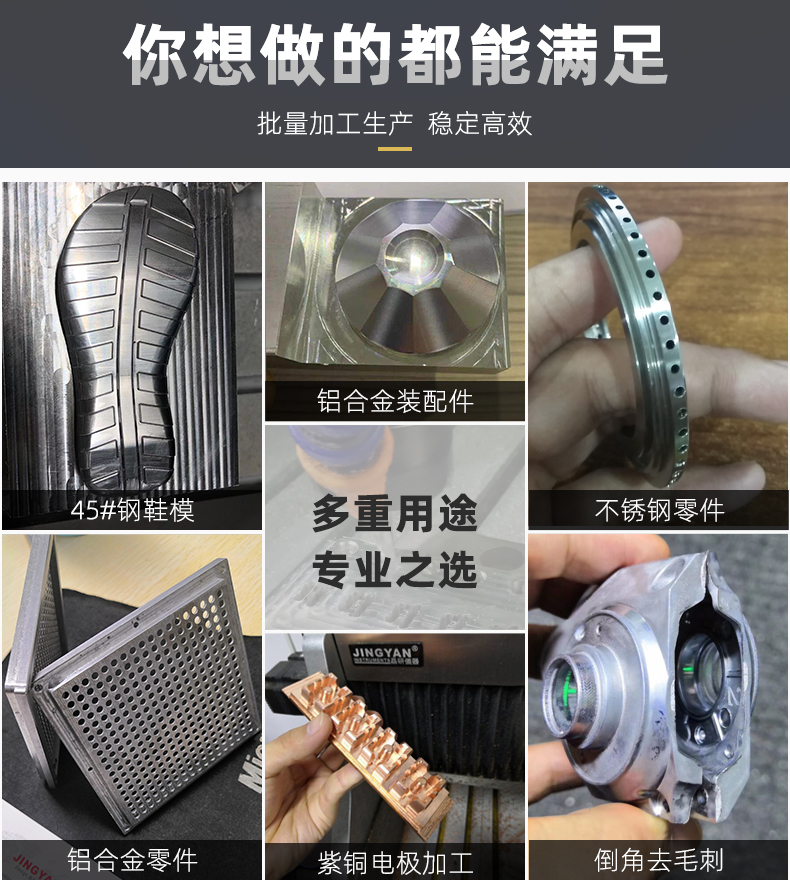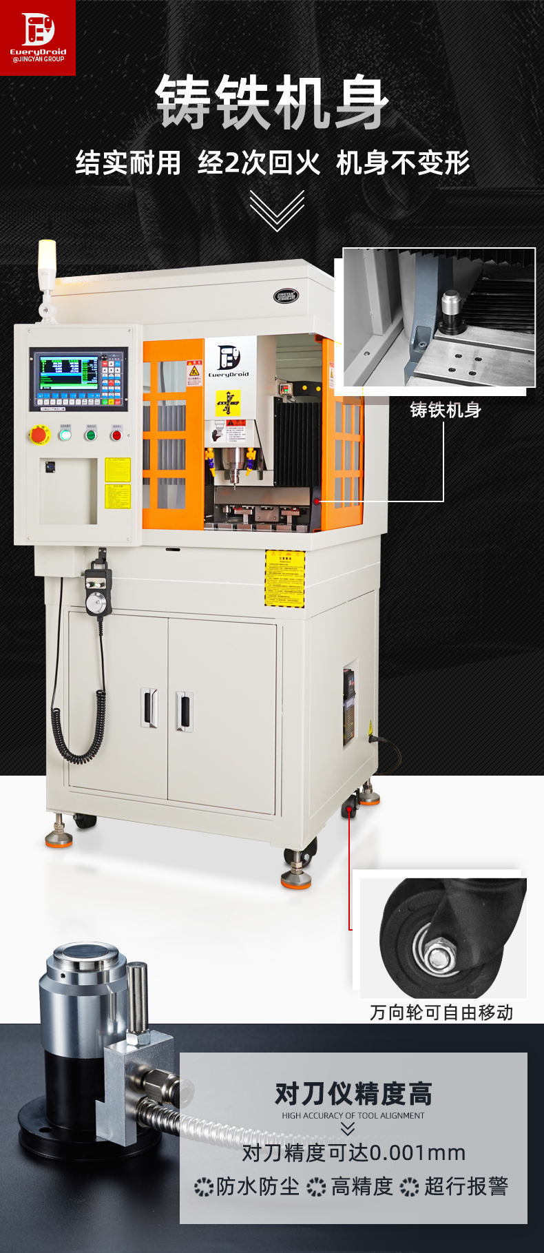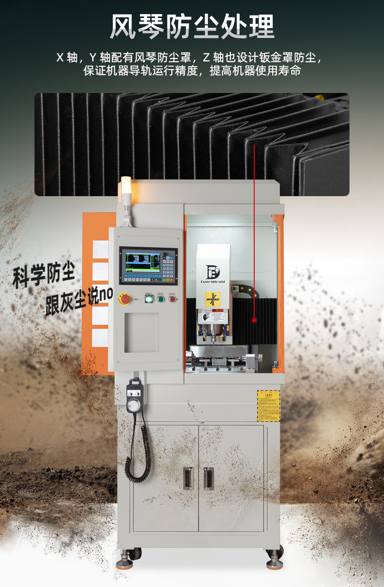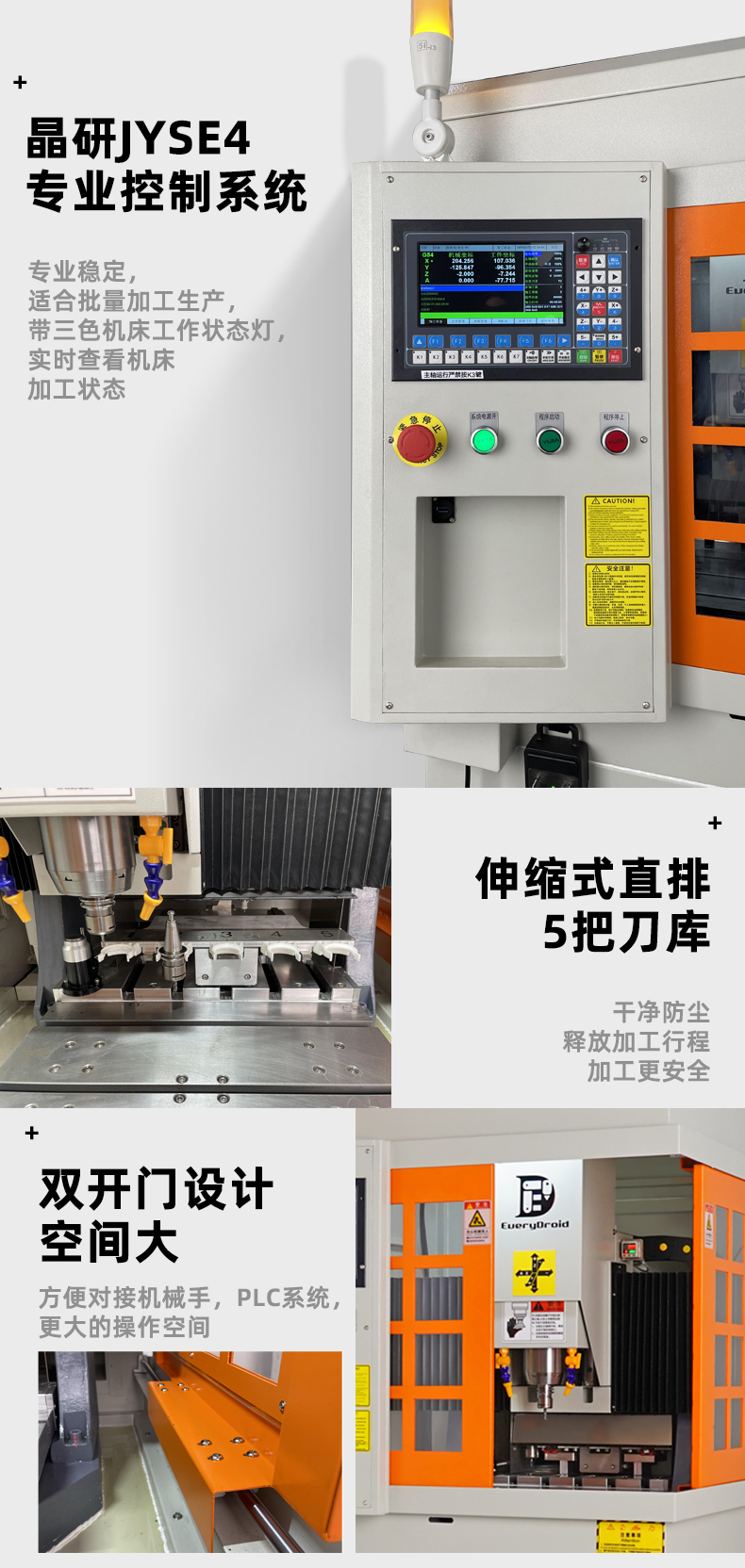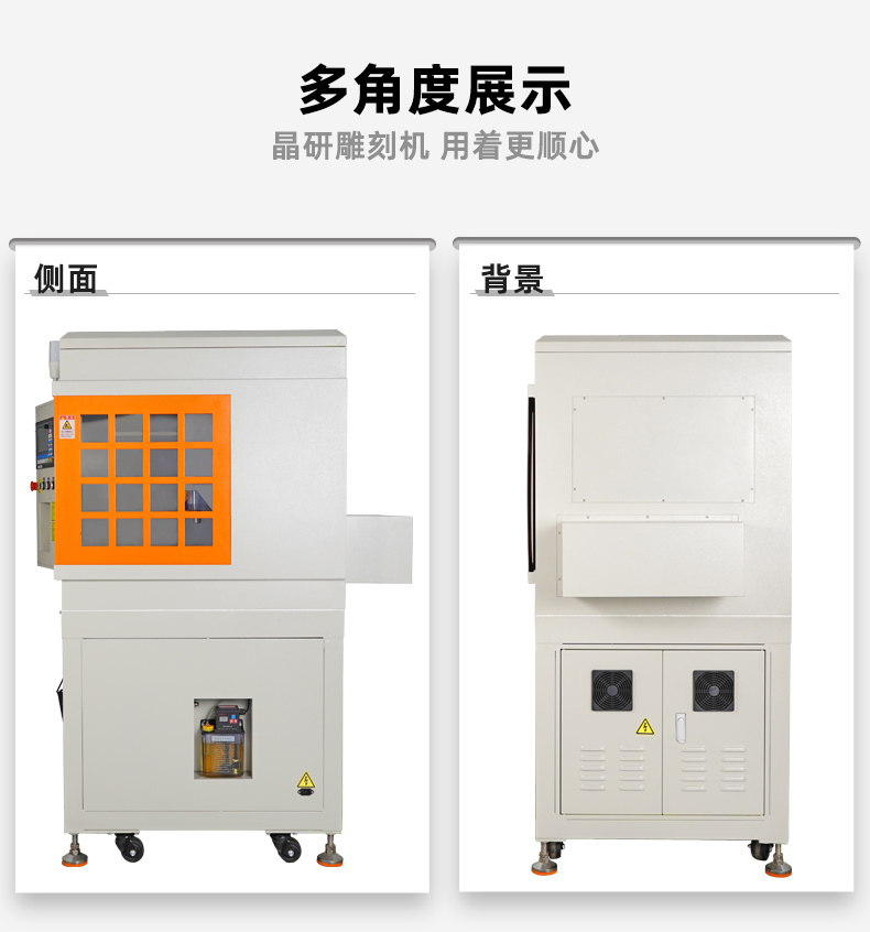 晶研V系列全封閉鑄鐵精雕機(jī)集高效、穩(wěn)定與多功能性于一身,設(shè)備運(yùn)用閉環(huán)電機(jī),確保快速響應(yīng)和高轉(zhuǎn)速,鑄鐵機(jī)身經(jīng)過(guò)特殊處理,堅(jiān)固耐用且不易變形,高精度諧波四軸加工精準(zhǔn),穩(wěn)定無(wú)回差,風(fēng)琴防塵設(shè)計(jì)和專業(yè)過(guò)濾系統(tǒng)有效延長(zhǎng)設(shè)備使用壽命,氣動(dòng)換刀主軸維持穩(wěn)定切削性能,JYSE4控制系統(tǒng)便于斷電續(xù)雕和跳行加工,全封閉設(shè)計(jì)非常適合批量生產(chǎn),而多樣配置則滿足個(gè)性化需求。