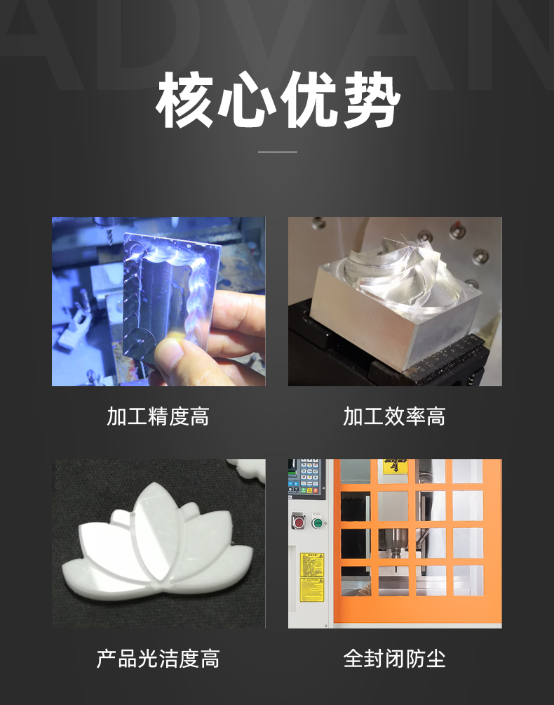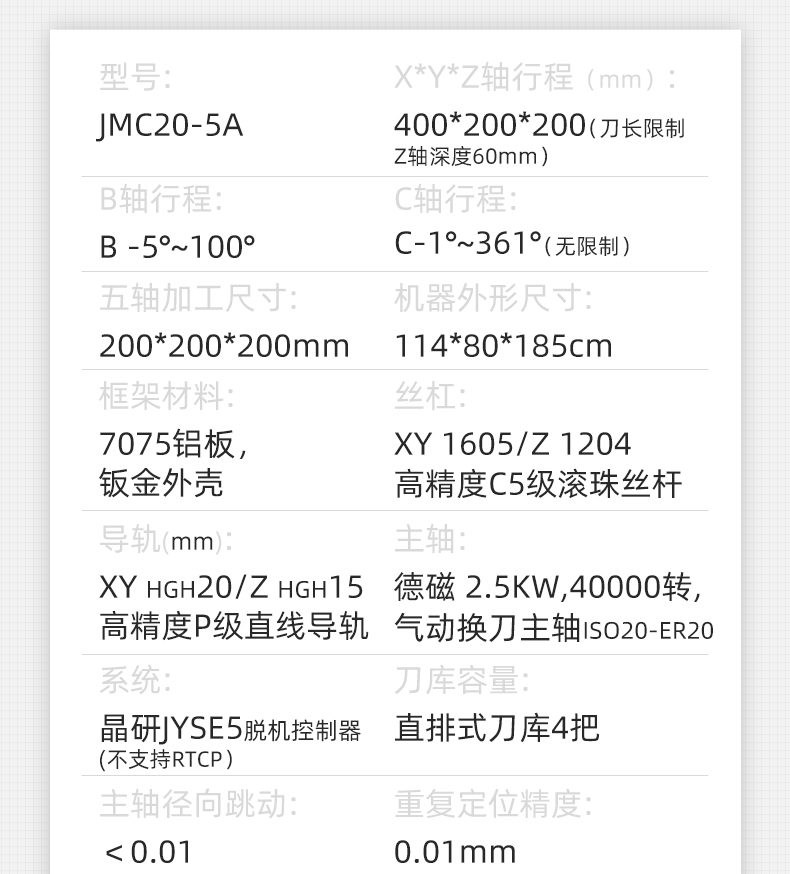 晶研BC搖籃五軸精雕機(jī),2.5KW氣動(dòng)換刀主軸,4把直排刀庫,配備精密滾珠絲桿和直線導(dǎo)軌,運(yùn)行順滑穩(wěn)定。采用進(jìn)口松下伺服電機(jī),BC兩軸諧波減速機(jī),精度高。JYSE5控制系統(tǒng)支持5軸聯(lián)動(dòng),操作簡單。大行程加工區(qū)域,B軸-5°~100°,C軸360°,五軸200×200×200mm三維加工尺寸,滿足復(fù)雜鏤空及五金零件加工需求。