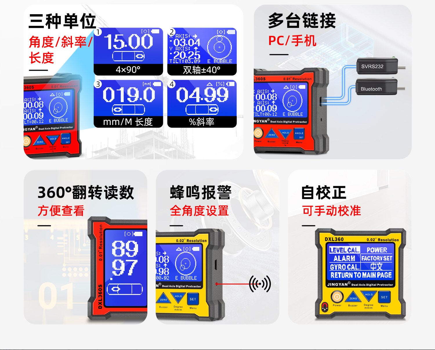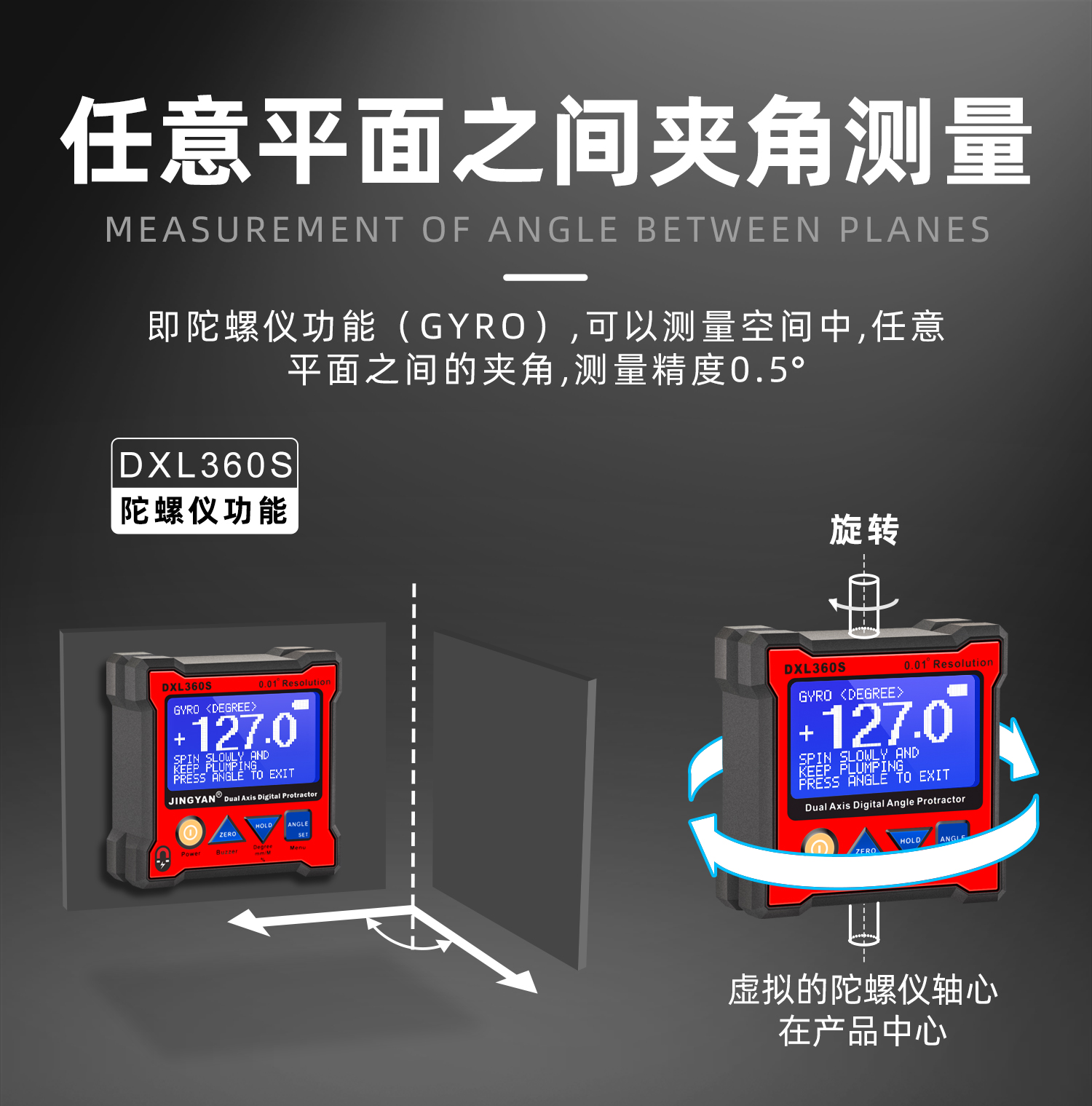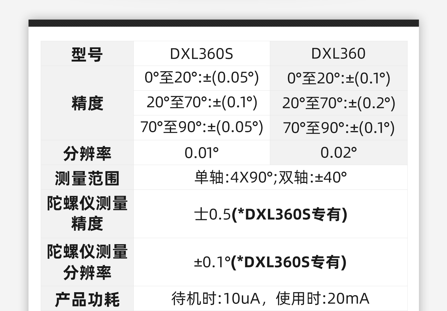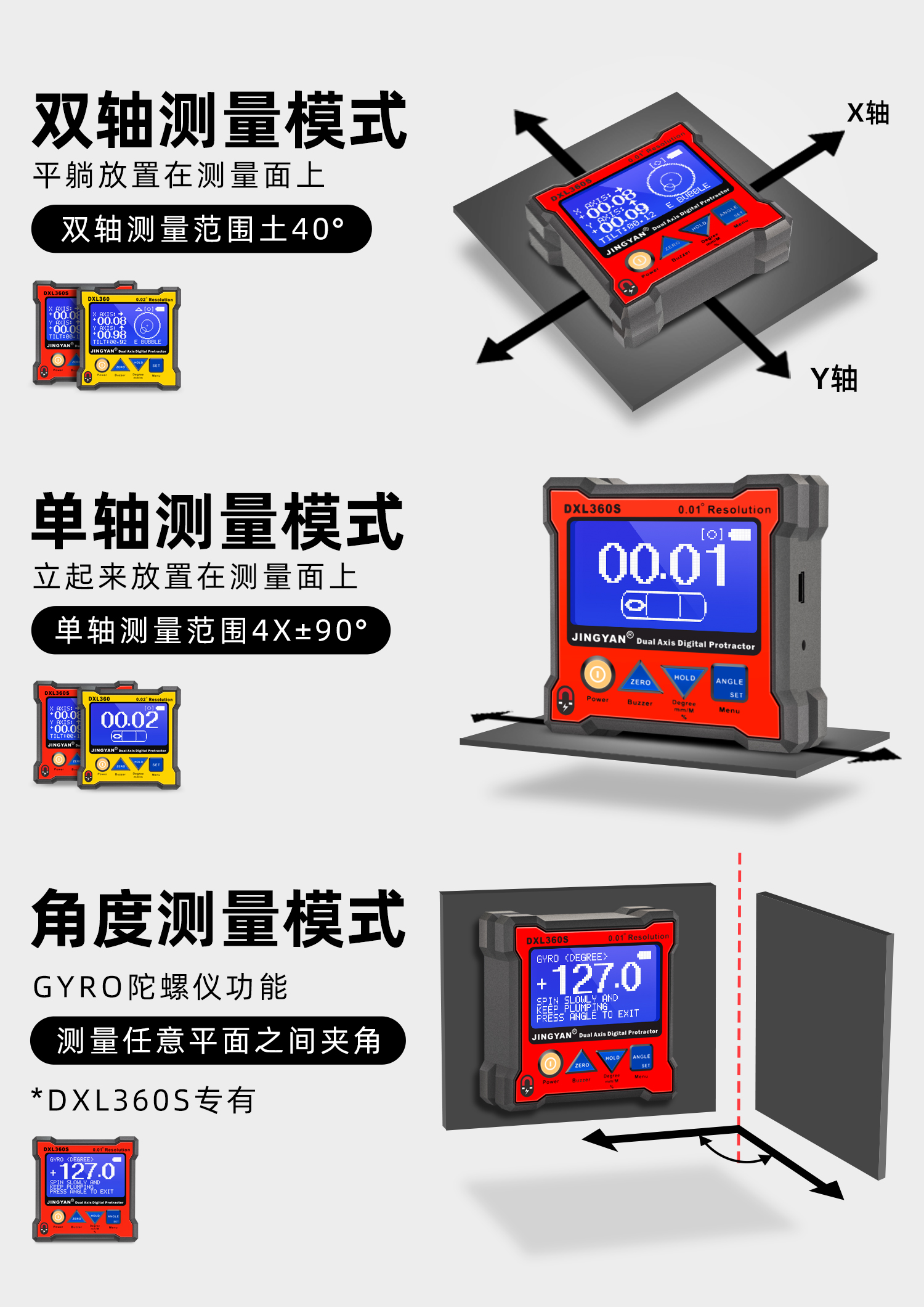 DXL360/S是一款專業(yè)測量水平和空間相對夾角(*DXL360S專有)的高精度數顯傾角儀/水平儀,它基于微機電系統(tǒng)(MEMS)的先進技術,結合優(yōu)化的補償模型算法,保證傾角儀測量的穩(wěn)定性和重復性。DXL360S精度高達0.05°,分辨率0.01°,可以采用3種測量單位顯示(角度、毫米/米、斜率),特有的空間相對夾角功能(GYRO),可不受環(huán)境限制,測量任意平面之間相對夾角,陀螺儀測量精度±0.5°。DXL360實現最好精度0.1°,分辨率0.02°,可以采用2種測量單位顯示(角度、毫米/米)。DXL360/S支持單軸4×90°,雙軸±40°測量,底部和背部測量基準面有強磁性,V型凹槽設計便于放置在圓管上進行測量。雙重數據存儲功能,連接電腦或手機進行數據傳輸。DXL360/S廣泛應用于機械制造、汽車維修、醫(yī)療行業(yè)、木材加工、通訊檢測、家居裝潢等用途。DXL360/S以其豐富的功能和實用性,廣受全球客戶青睞。