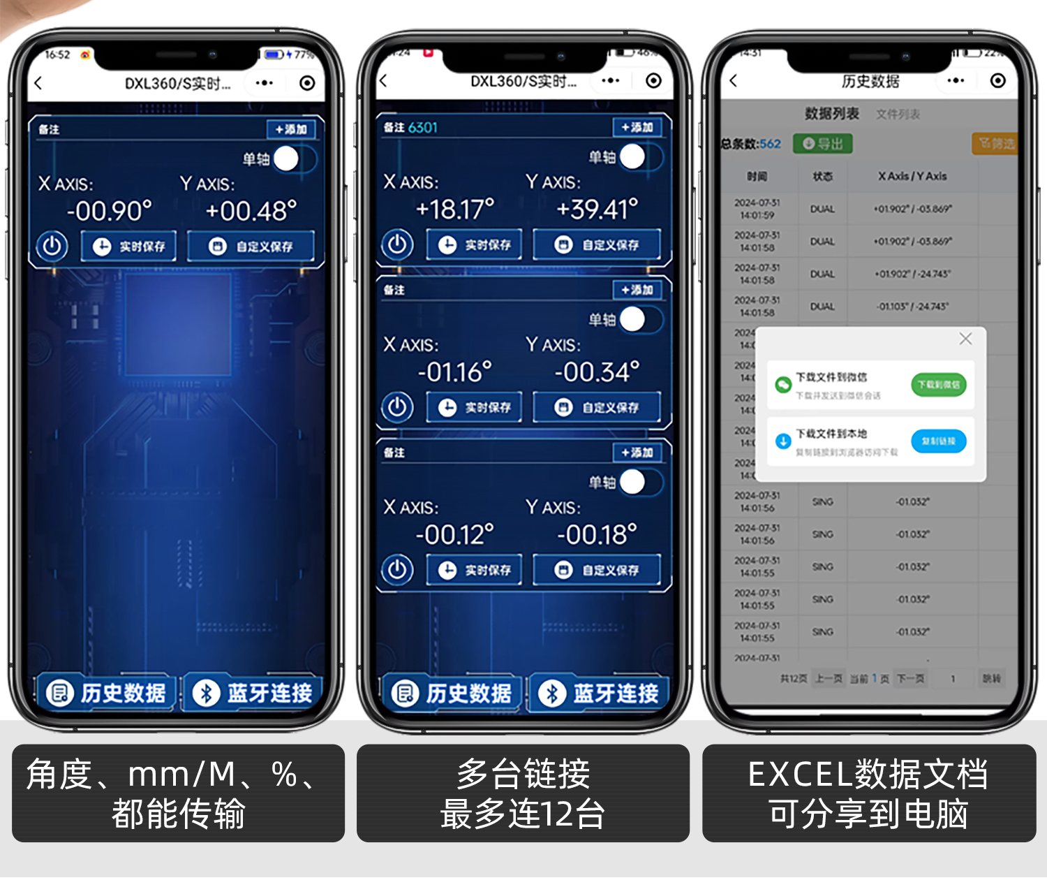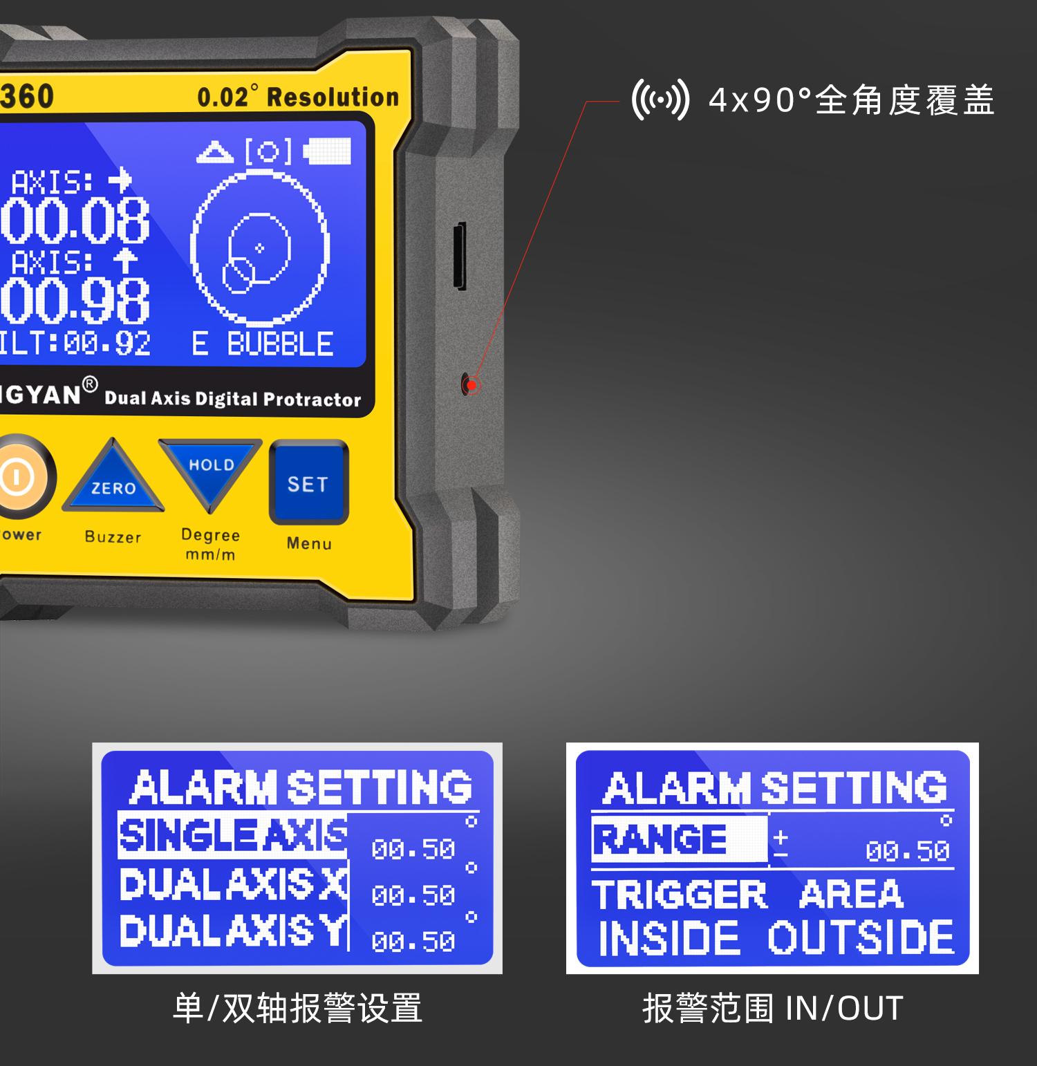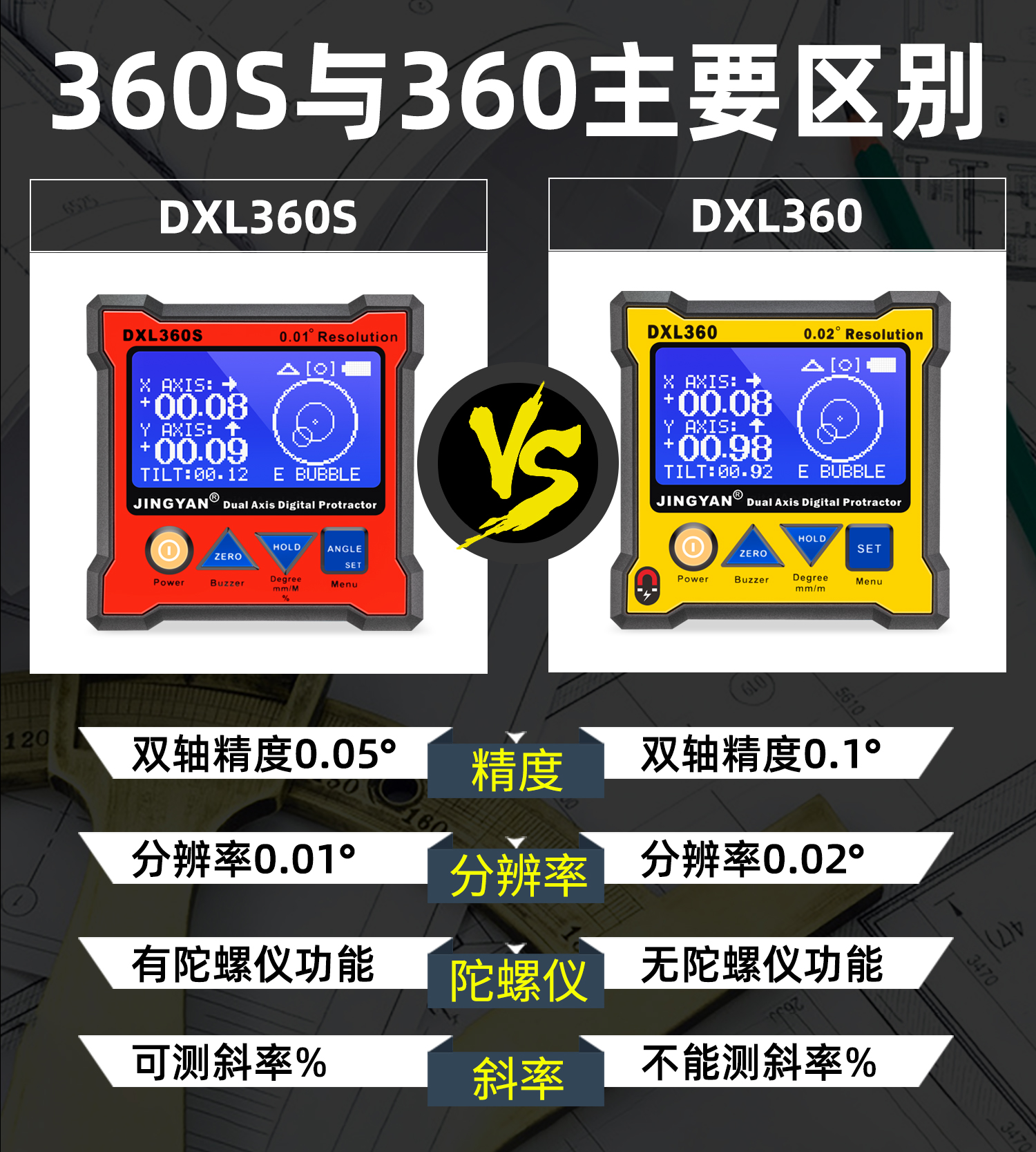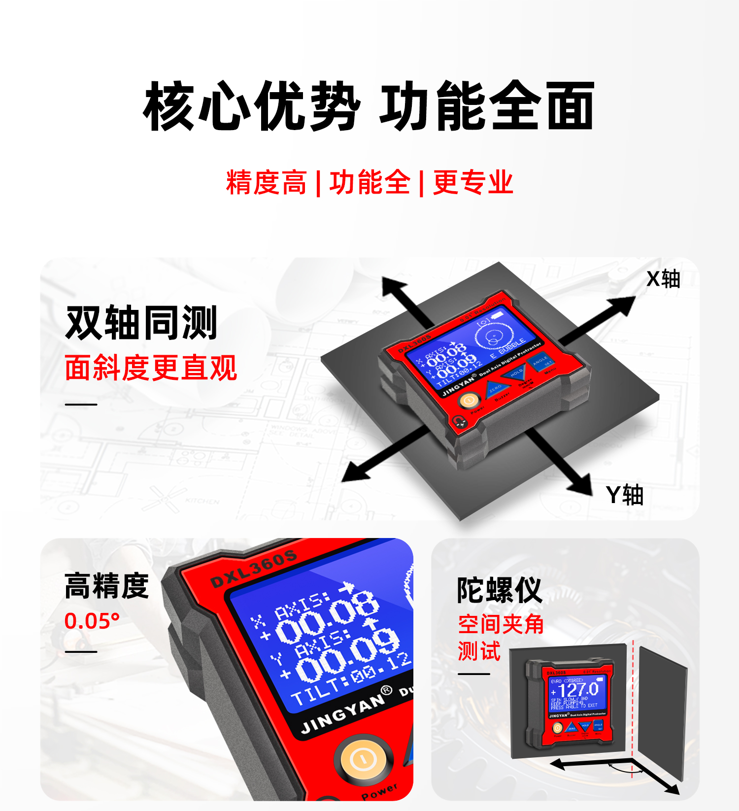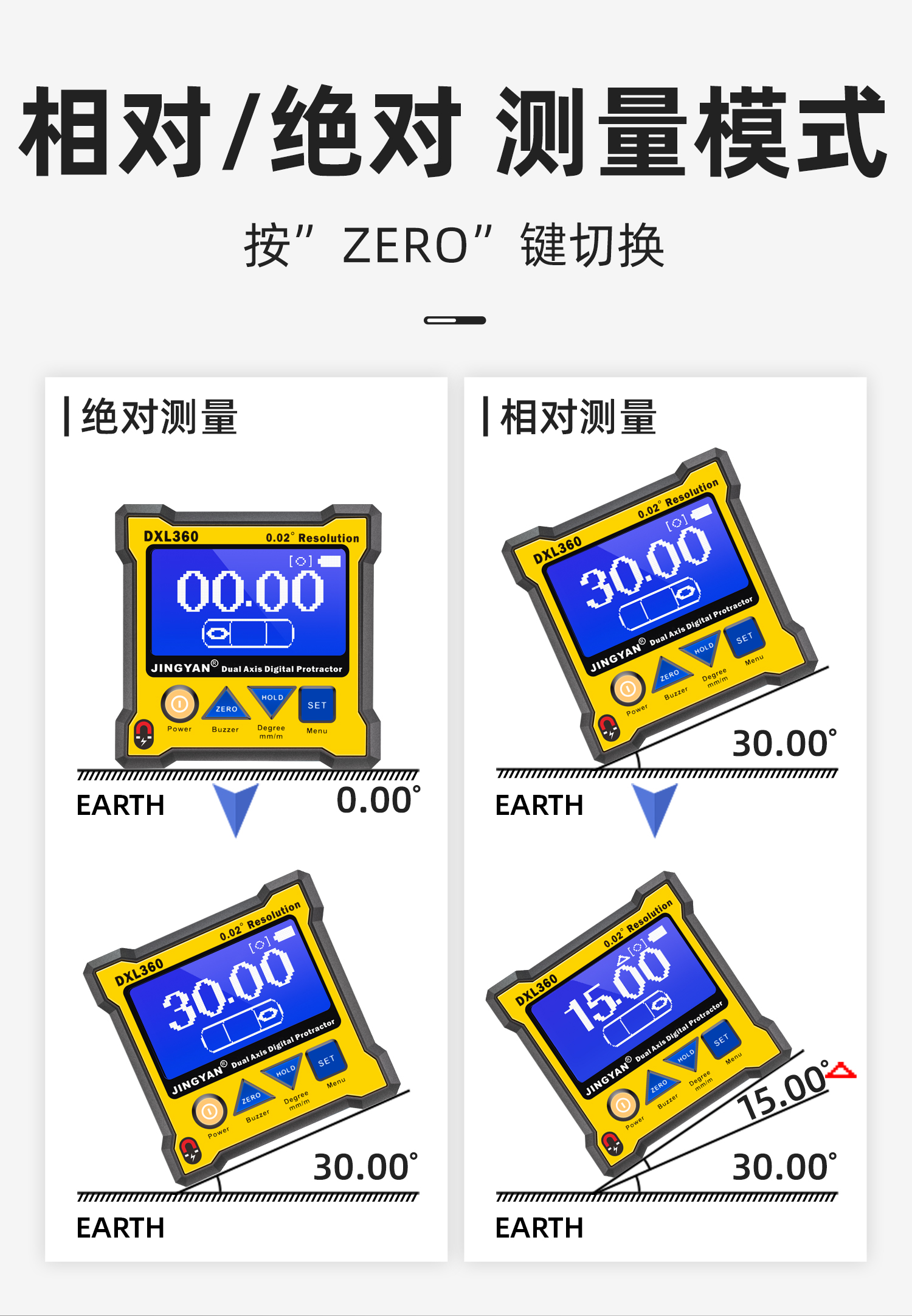 DXL360/S是一款專業(yè)測量水平和空間相對夾角(*DXL360S專有)的高精度數顯傾角儀/水平儀,它基于微機電系統(tǒng)(MEMS)的先進技術,結合優(yōu)化的補償模型算法,保證傾角儀測量的穩(wěn)定性和重復性。DXL360S精度高達0.05°,分辨率0.01°,可以采用3種測量單位顯示(角度、毫米/米、斜率),特有的空間相對夾角功能(GYRO),可不受環(huán)境限制,測量任意平面之間相對夾角,陀螺儀測量精度±0.5°。DXL360實現最好精度0.1°,分辨率0.02°,可以采用2種測量單位顯示(角度、毫米/米)。DXL360/S支持單軸4×90°,雙軸±40°測量,底部和背部測量基準面有強磁性,V型凹槽設計便于放置在圓管上進行測量。雙重數據存儲功能,連接電腦或手機進行數據傳輸。DXL360/S廣泛應用于機械制造、汽車維修、醫(yī)療行業(yè)、木材加工、通訊檢測、家居裝潢等用途。DXL360/S以其豐富的功能和實用性,廣受全球客戶青睞。