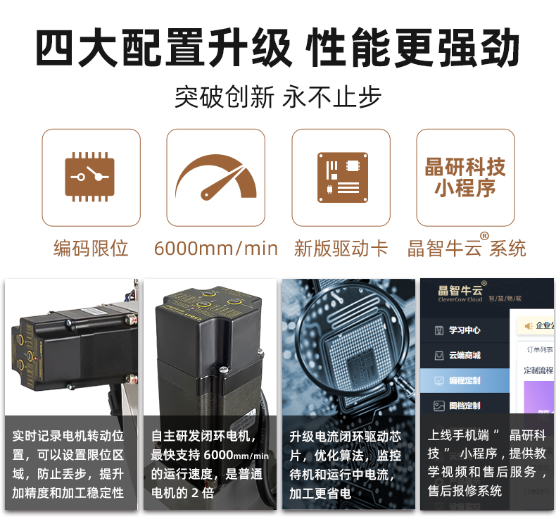 晶研M系列桌面雕刻機提供多種功率選擇,適應不同硬度材料加工需求。其高精度編碼限位系統(tǒng)、高速閉環(huán)電機和智能驅動卡,確保了加工的精度、速度和節(jié)能效果。此外,晶智牛云系統(tǒng)和手機小程序為用戶提供了便捷的教學和售后服務,使其成為工業(yè)應用的理想選擇。