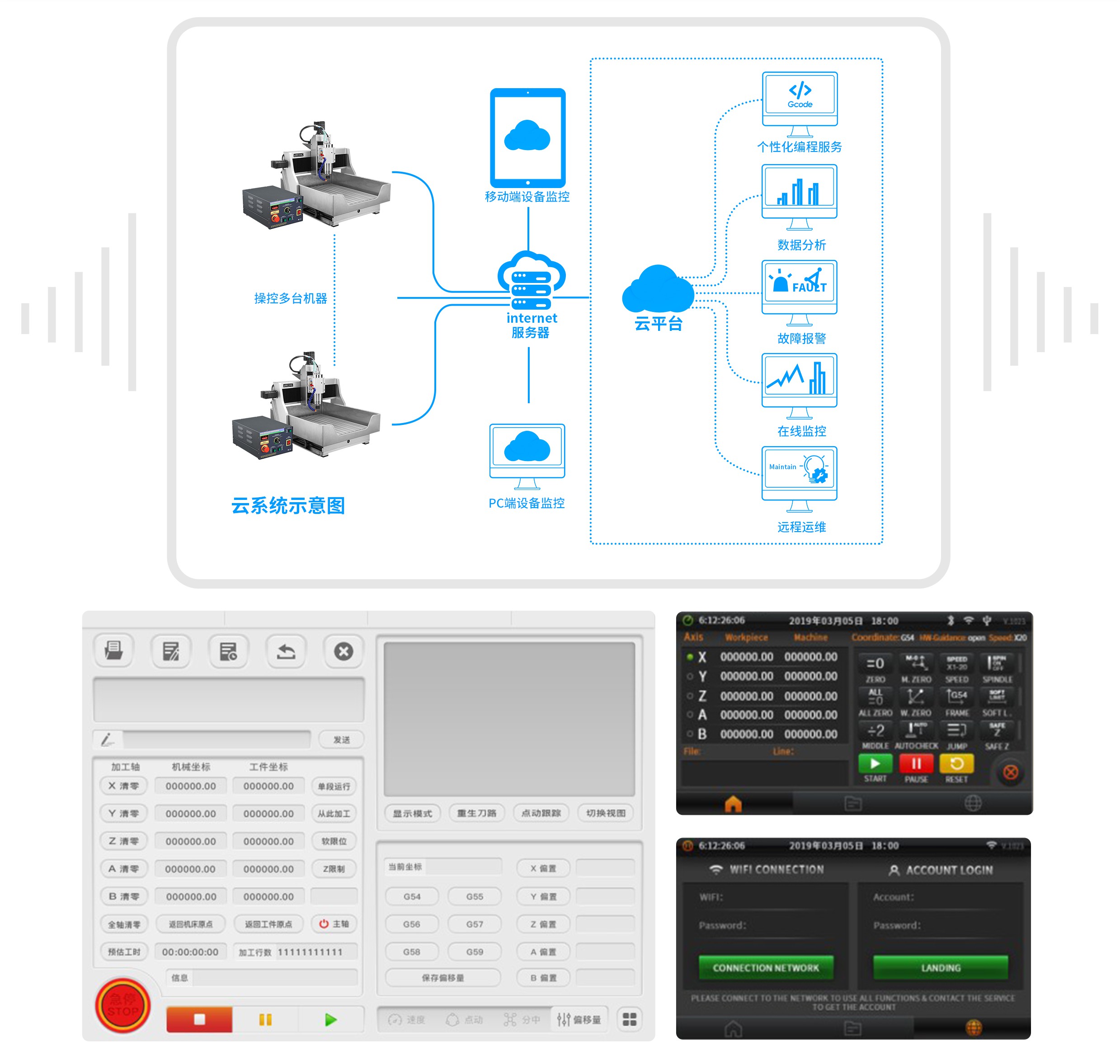 晶研CNC云系統(tǒng)由四部分,機(jī)床控制電箱、ipad控制系統(tǒng),電腦網(wǎng)頁(yè),后臺(tái)服務(wù)器。通過(guò)藍(lán)牙連接機(jī)床的控制電箱,可以對(duì)機(jī)床進(jìn)行常規(guī)操作,ipad操作系統(tǒng)上的所有操作記錄,機(jī)床控制電箱的運(yùn)行記錄,都會(huì)通過(guò)互聯(lián)網(wǎng)將數(shù)據(jù)直接發(fā)送到服務(wù)器保存。用戶可使用電腦通過(guò)特定的網(wǎng)頁(yè),經(jīng)由互聯(lián)網(wǎng)連接服務(wù)器,提取機(jī)器運(yùn)行所有記錄,監(jiān)控機(jī)器運(yùn)行狀態(tài)。