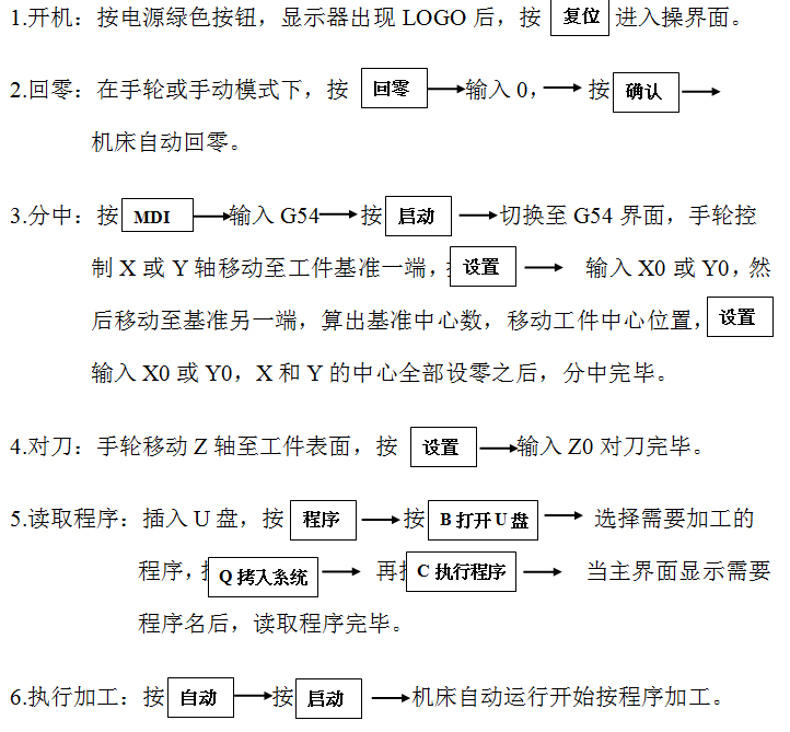 對刀操作是由Z軸至加工件表面,進行設(shè)置輸入Z0進行對刀完畢。數(shù)控系統(tǒng)的編程與程序設(shè)置需先插入U盤,按‘程序’按鈕,進出界面選擇‘B打開U盤’的時候,選擇需要加工的程序,按‘Q拷入系統(tǒng)’在界面上按‘C執(zhí)行程序’,當主界面顯示需要的程序名后,讀取程序完畢。