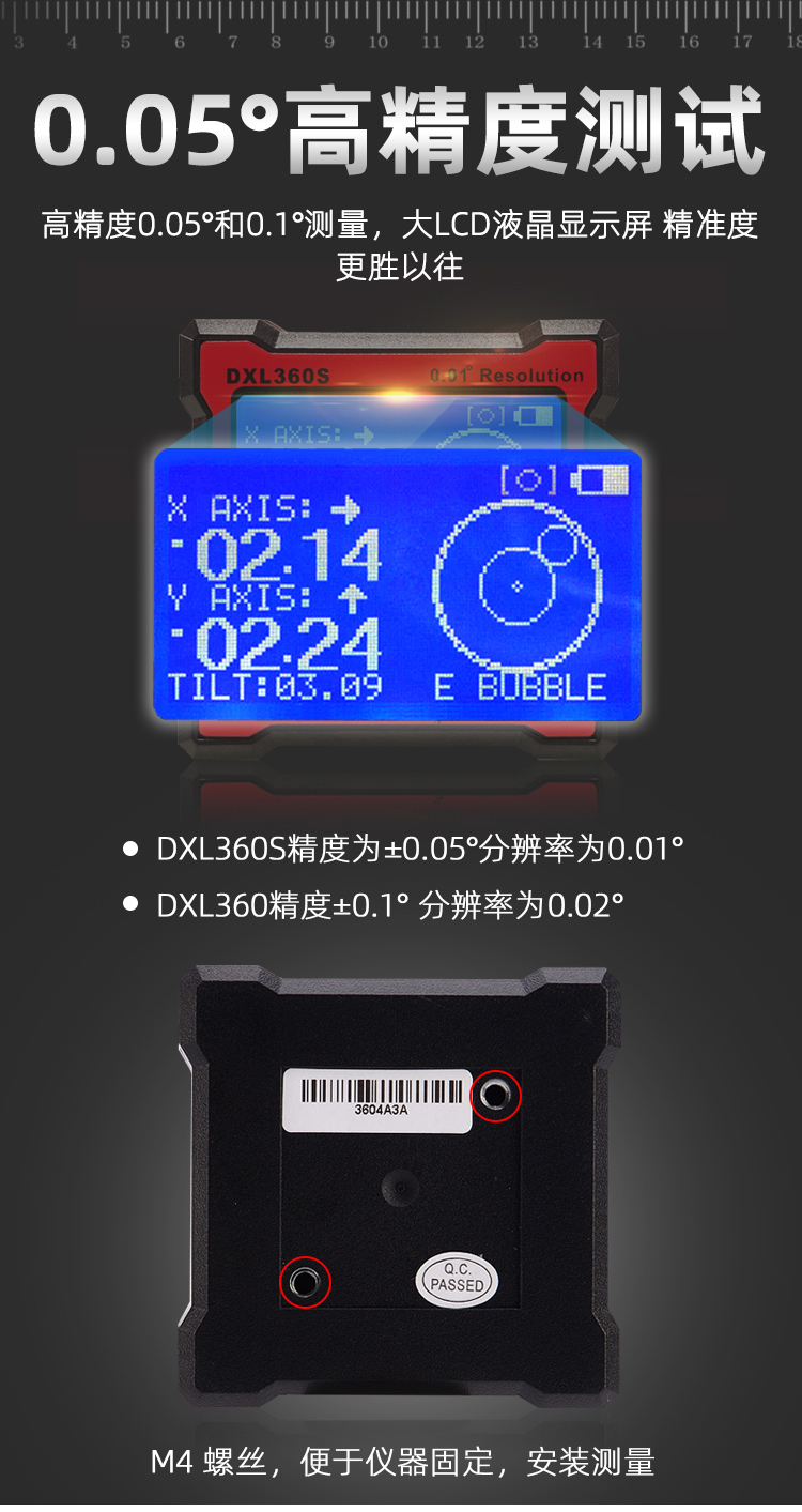 對于測試要求比較高的場景,精準(zhǔn)度是非常重要的一個衡量標(biāo)準(zhǔn),細微的偏差都可能產(chǎn)生不良的后果。晶研的這款DXL360S雙軸水平儀,高精度±0.05°,分辨率可達0.01°支持雙軸測試±40°的測量范圍,可以勝任大部分高精度測試場景。清晰的LCD顯示屏,能夠方面我們更加輕松直觀的讀數(shù),精準(zhǔn)度更勝以往!